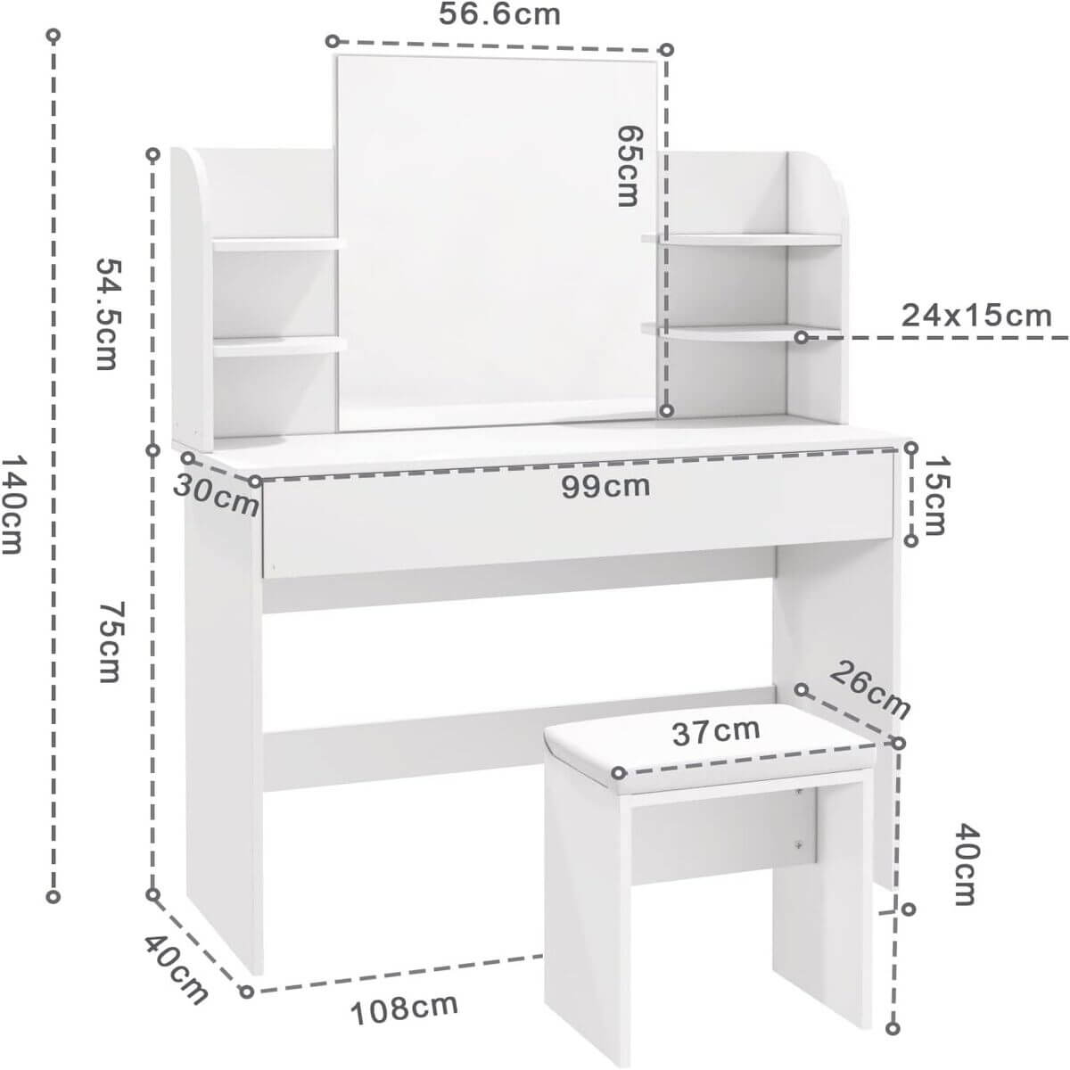 - 【DIMENCIÓN】: Tocador tamaño 108x40x140cm, tamaño taburete 37 x 26 x 40cm.