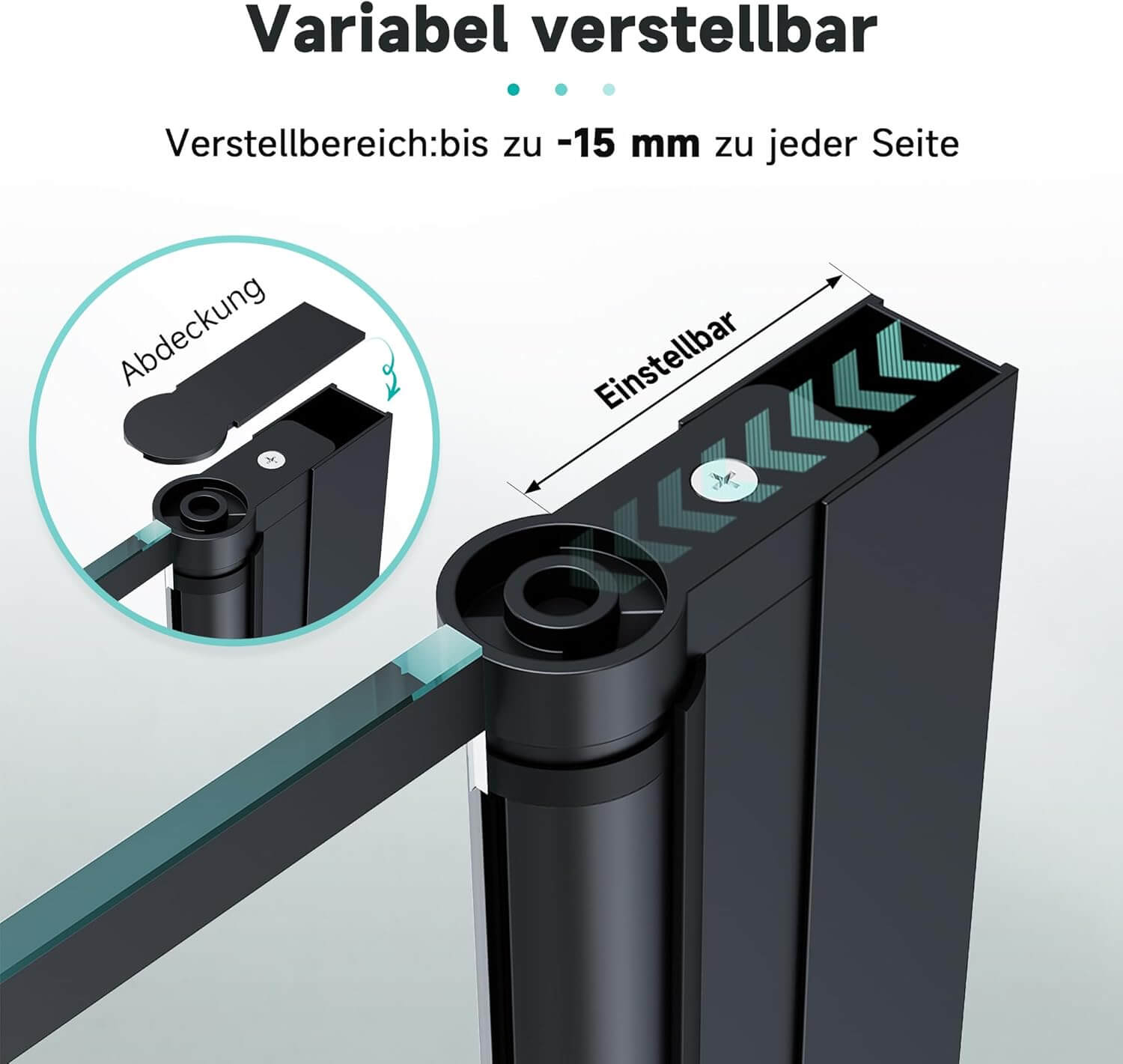 - Diseño de puerta corredera: con dimensiones de y un ajuste de 15 mm por un lado, nuestra puerta de ducha es extremadamente flexible. Se puede girar 180°, lo que ahorra espacio y amplía tus posibilidades de diseño.